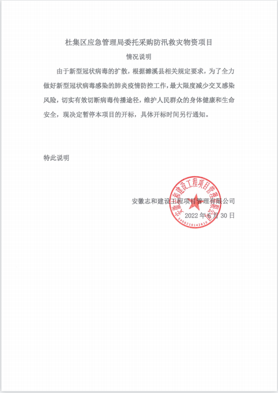 杜集區應急管理局委托采購防汛救災物資項目情況說明 2022-06-30 10:51 上一篇:淮北市杜集區檢察院職工食堂裝飾改造工程 (邀請招標)招標公告 下一篇:淮北百蓮百荷荷花基地夜景照明工程 招標公告 返回列表
