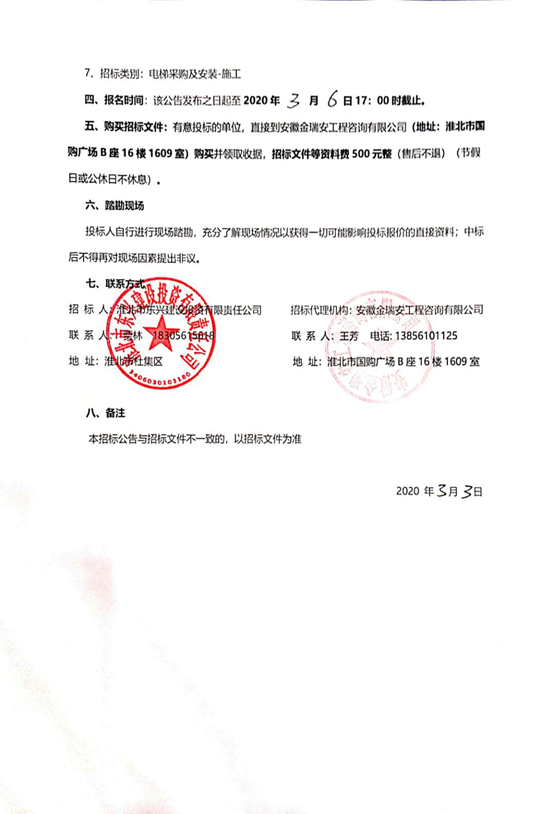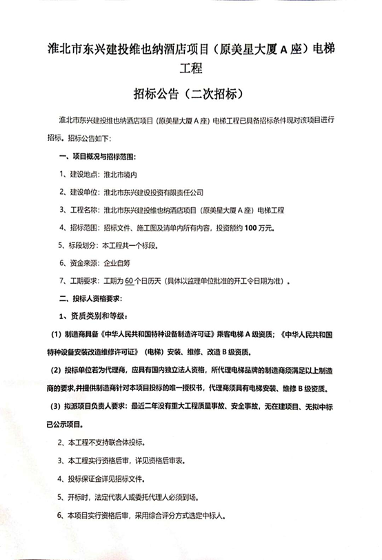 淮北市東興建投維也納酒店項(xiàng)目(原美星大廈A座)電梯工程招標(biāo)公告(二次招標(biāo)) 2020-03-03 16:03 上一篇:安徽省淮北市杜集區(qū)重點(diǎn)采煤沉陷區(qū)杜集區(qū)人民醫(yī)院搬遷項(xiàng)目地質(zhì)災(zāi)害報(bào)告書編制詢價(jià)公告 下一篇:淮北市高岳(省級(jí))現(xiàn)代農(nóng)業(yè)產(chǎn)業(yè)園門樓及導(dǎo)視景觀設(shè)計(jì)招標(biāo)公告(邀請(qǐng)招標(biāo)) 返回列表