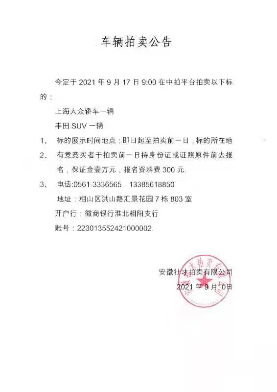 車輛拍賣公告 2021-09-10 11:29 上一篇:淮北市杜集區(qū)全民健身活動中心信息系統(tǒng)集成服務采購項目 下一篇:淮北杜集區(qū)小區(qū)電瓶車充電樁二期工程招標公告 返回列表